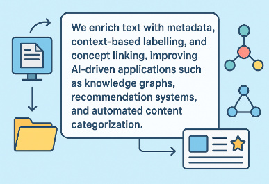 We enrich text with metadata, context-based labelling, and concept linking, improving AI-driven applications such as knowledge graphs, recommendation systems, and automated content categorization.